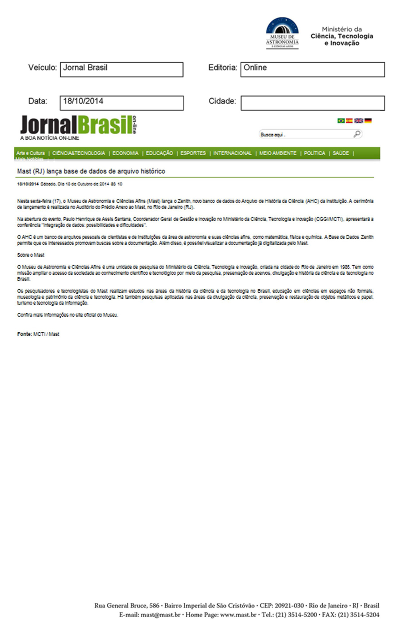 Jornal Brasil | MAST (RJ) lança base de dados de arquivo histórico