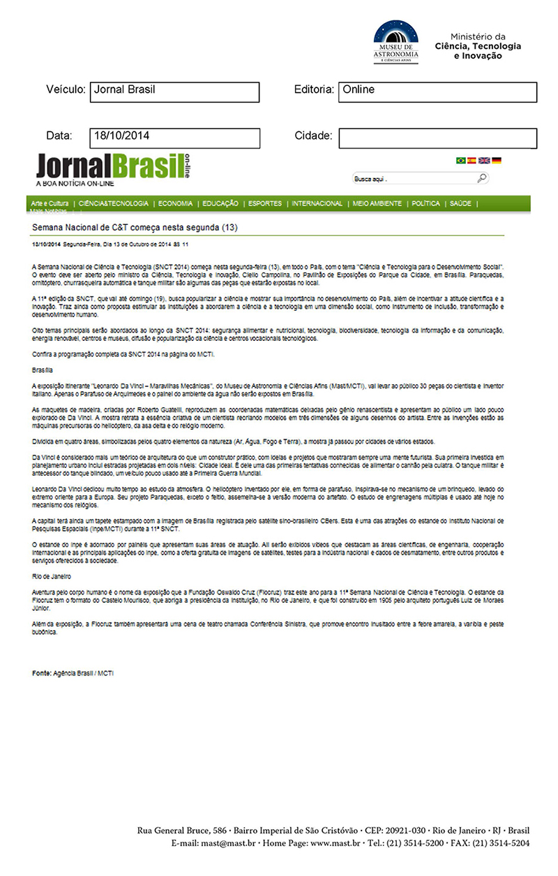 Jornal Brasil | Semana Nacional de C&T começa nesta segunda (13)