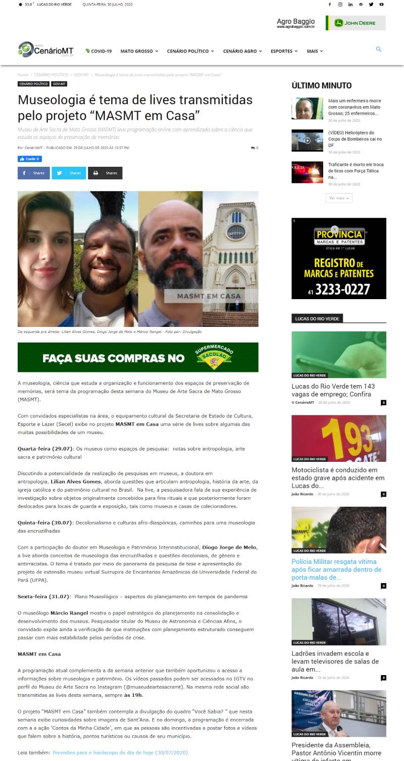 Jornal Cenário MT on-line (Cuiabá-MT) | MAST participa de série de lives sobre Museologia promovida pelo Museu de Arte Sacra de Mato Grosso, no Projeto 'MASMT em Casa'