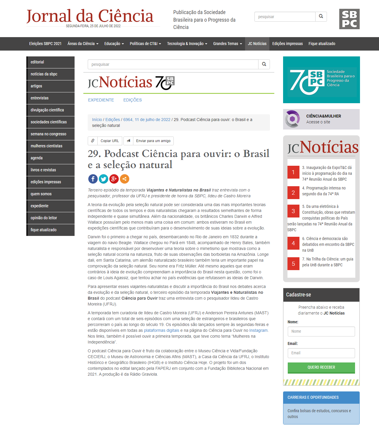 Jornal da Ciência / Boletim JC Notícias - MAST na reportagem "Podcast Ciência para Ouvir: o Brasil e a seleção natural"