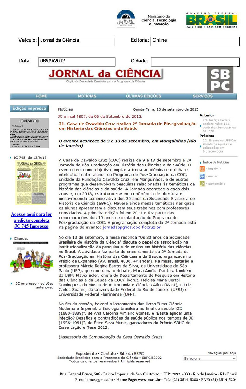 Jornal da Ciência | Casa de Oswaldo Cruz realiza 2ª Jornada de Pós-graduação em História das Ciências e da Saúde