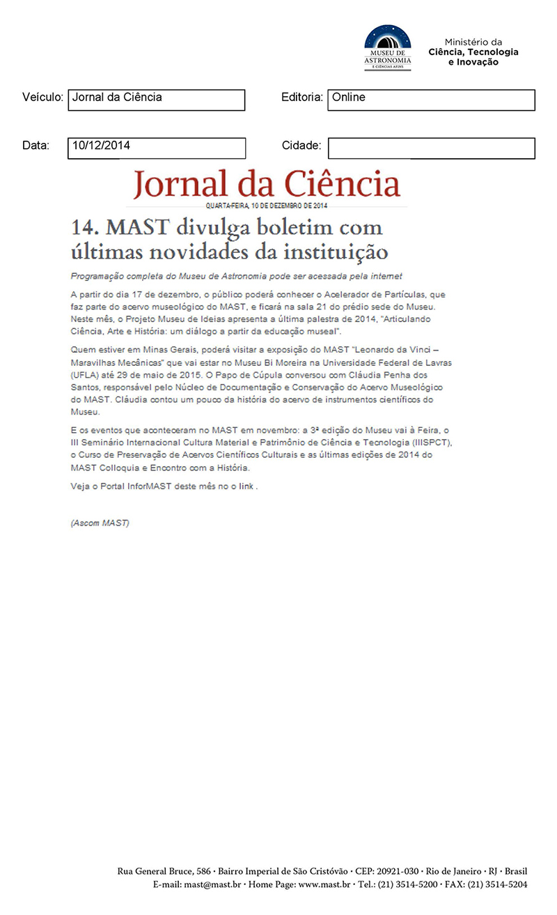 Jornal da Ciência | MAST divulga boletim com última novidade da instituição