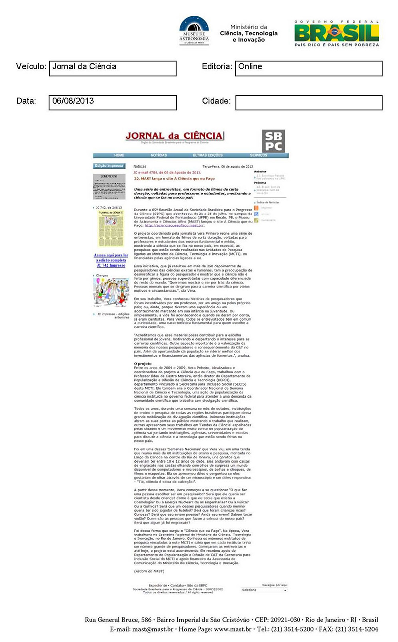 Jornal da Ciência | MAST lança o site A Ciência que Eu Faço