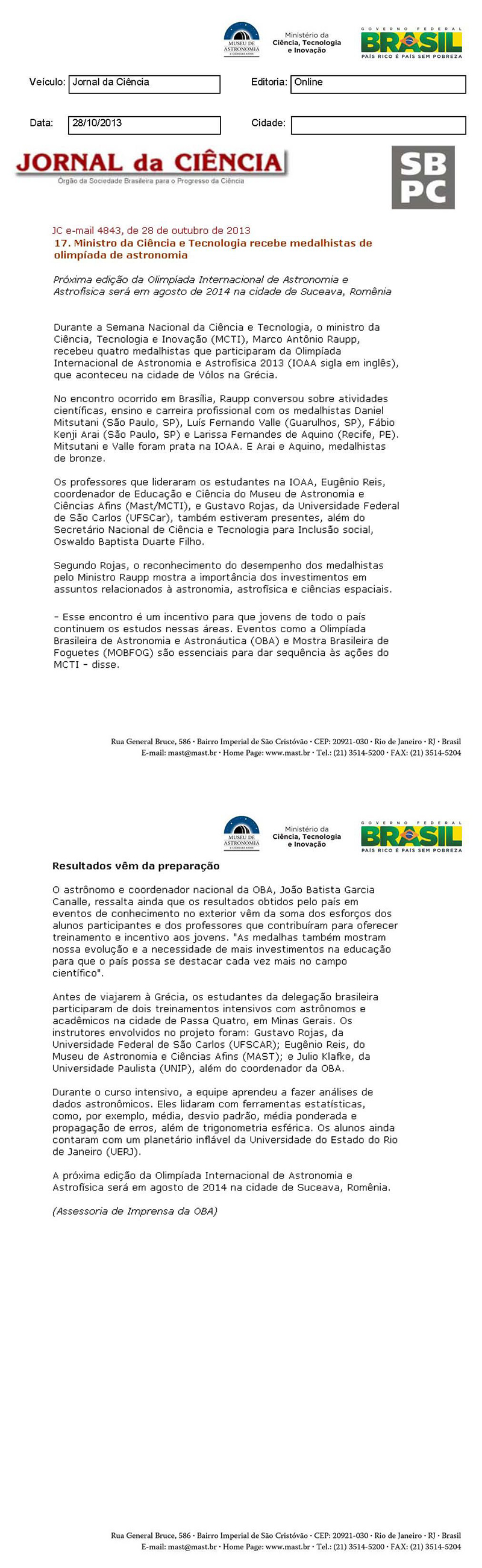 Jornal da Ciência | Ministério da Ciência e Tecnologia recebe medalhistas de olimpíada de astronomia