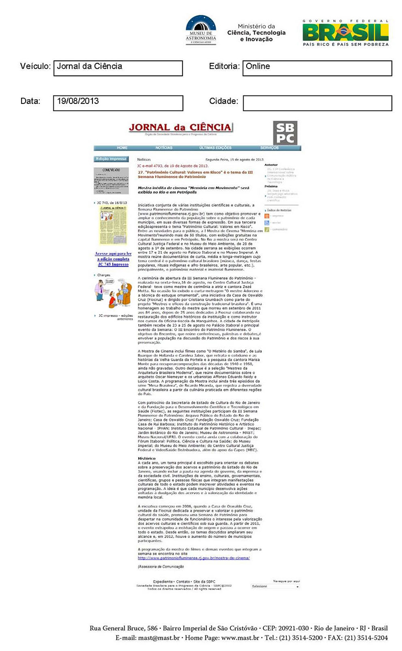 Jornal da Ciência | "Patrimônio Cultural: Valores em Risco" é o tema da III Semana Fluminense do Patrimônio