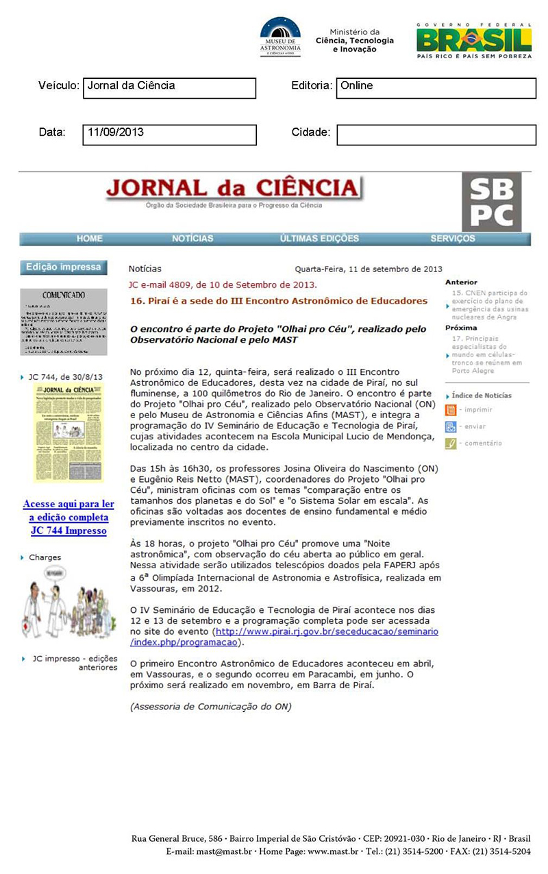 Jornal da Ciência | Piraí é a sede do III Encontro Astronômico de Educadores