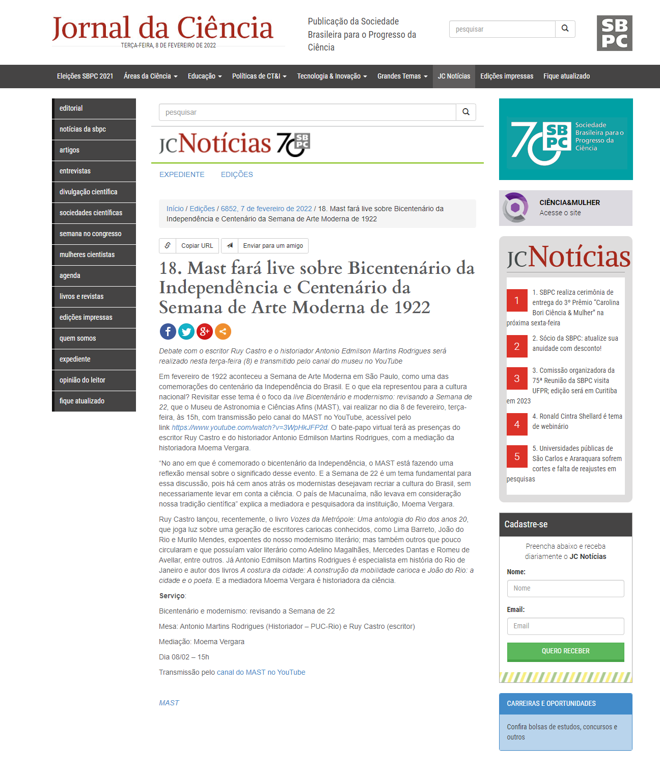 Jornal da Ciência - SBPC / Boletim JC Norícias - MAST promove live Bicentenário e Modernismo: revisando a Semana de 22