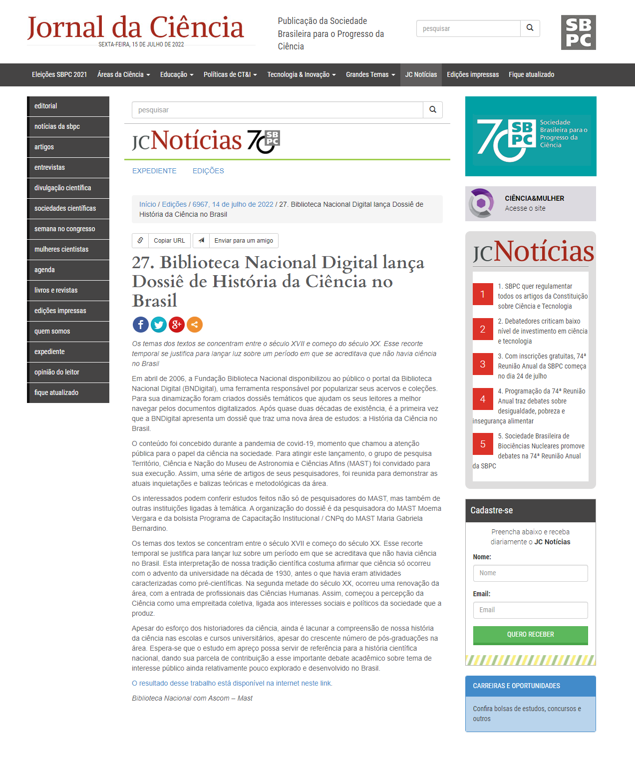 Jornal da Ciência SBPC - MAST participa da criação do dossiê de História da Ciência para a Biblioteca Nacional
