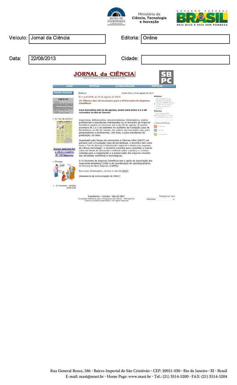 Jornal da Ciência | Últimos dias de onscrições para o VI Encontro de Acervos Científicos