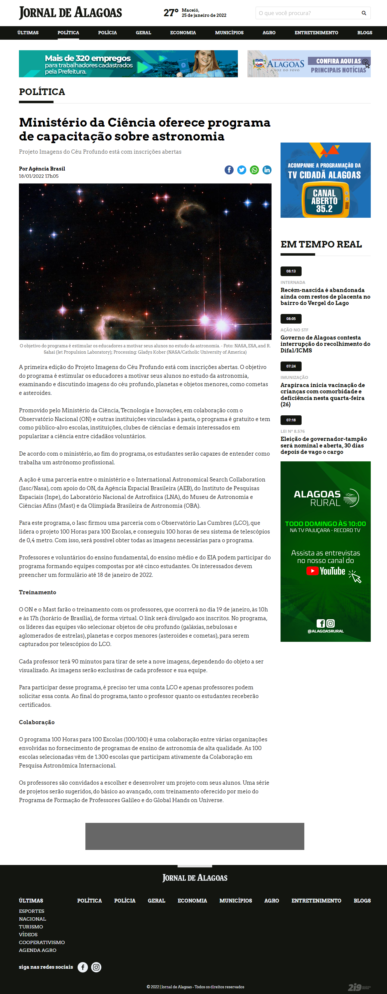 Jornal de Alagoas (Maceió-AL) - MAST na reportagem 'Ministério oferece programa de capacitação sobre astronomia'