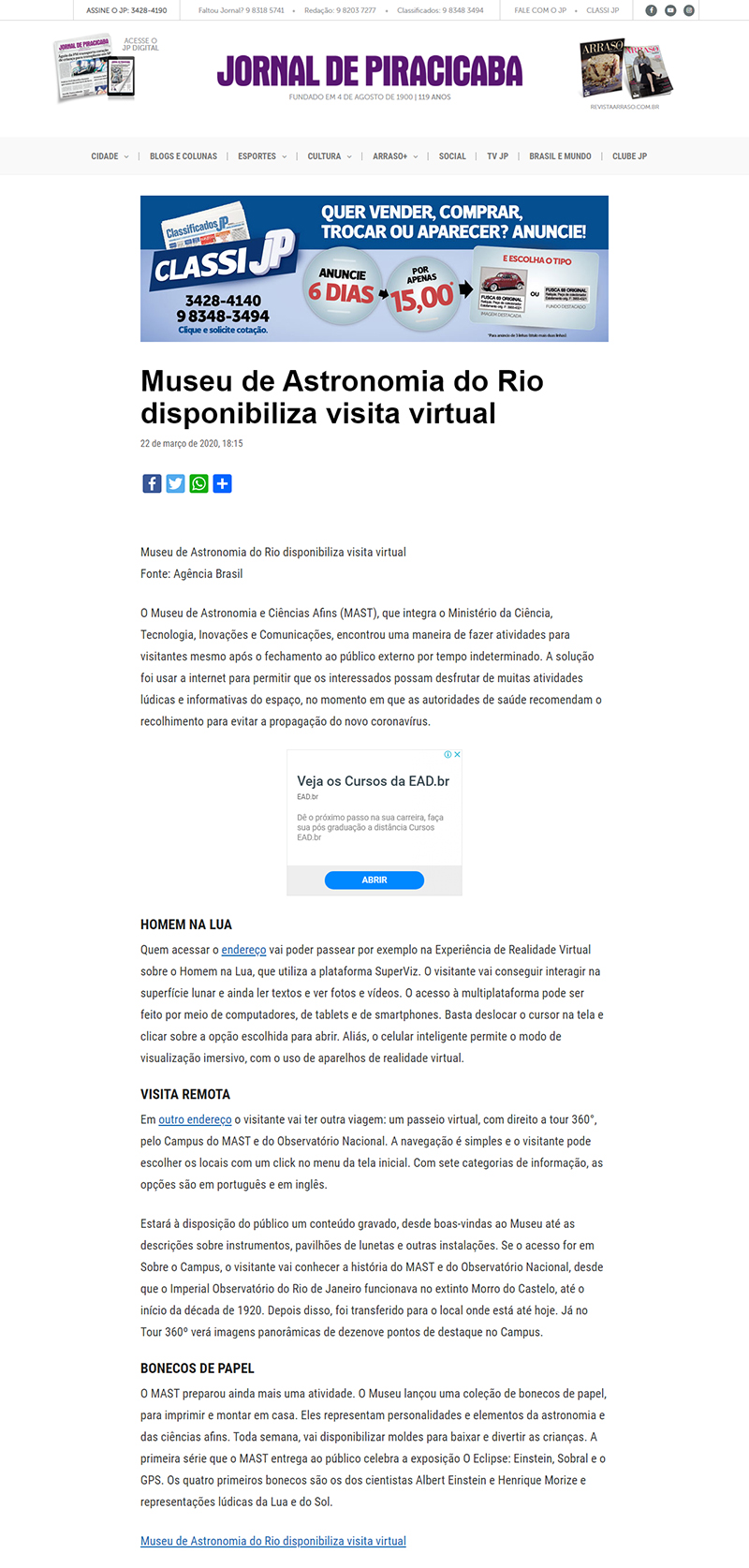 Jornal de Piracicaba (Piracicaba - SP) | MAST disponibiliza visita virtual