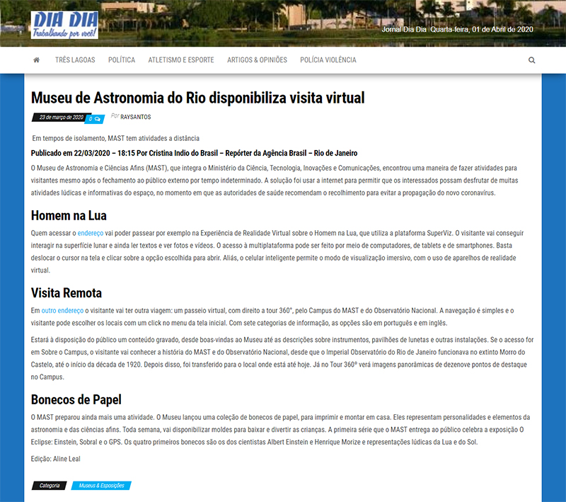 Jornal Dia a Dia online (Três Lagoas - MS) | MAST disponibiliza visita virtual