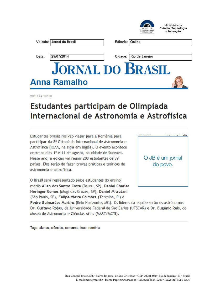 Jornal do Brasil | Estudantes participam de Olimpíada Internacional de Astronomia e Astrofísica