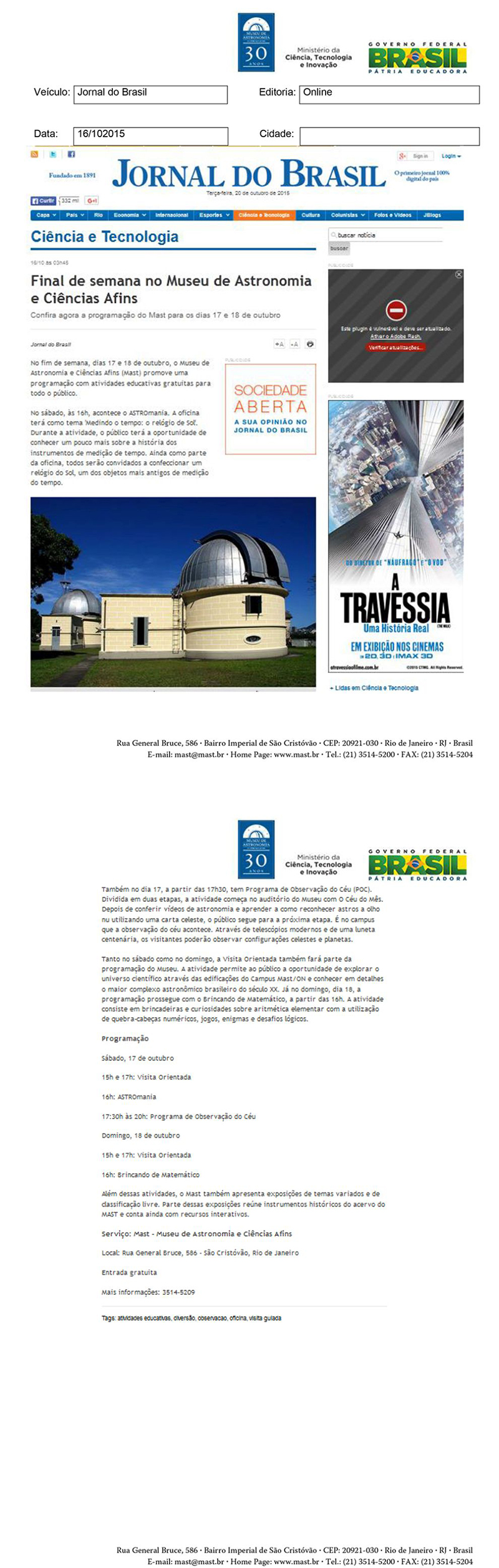 Jornal do Brasil | Final de semana no Museu de Astronomia e Ciências Afins