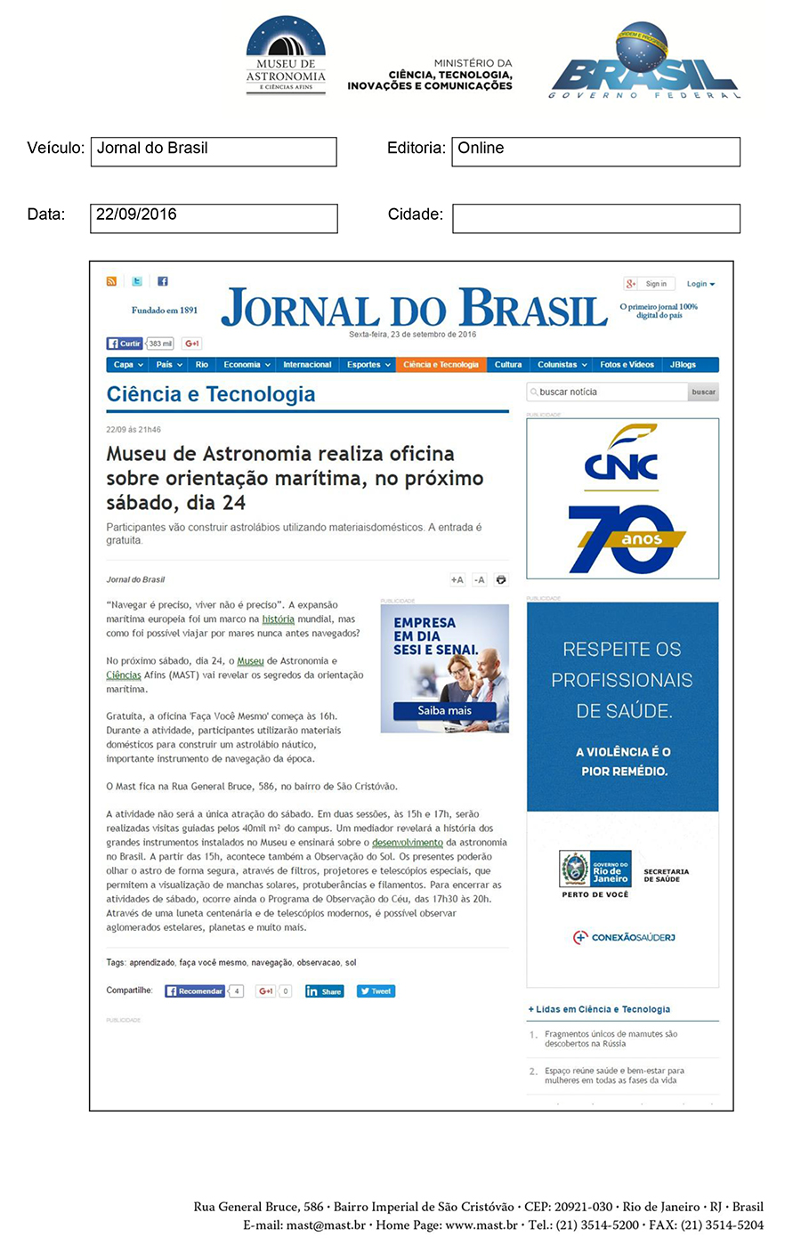 Jornal do Brasil | Museu de Astronomia realiza oficina sobre orientação marítima, no próximo sábado, dia 24
