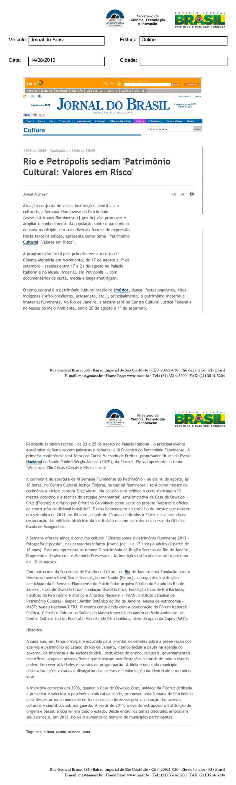 Jornal do Brasil | Rio e Petrópolis sediam "Patrimônio Cultural: Valores em Risco"