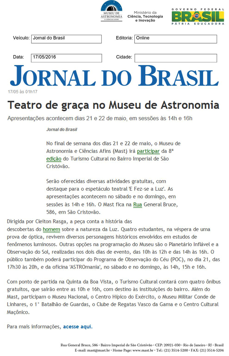 Jornal do Brasil | Teatro de graça no Museu de Astronomia