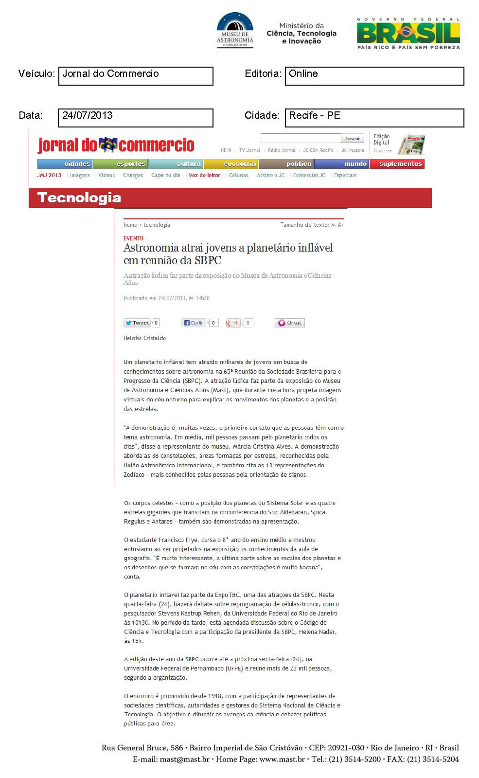 Jornal do Commercio | Astronomia atrai jovens a planetário inflável em reunião da SBPC