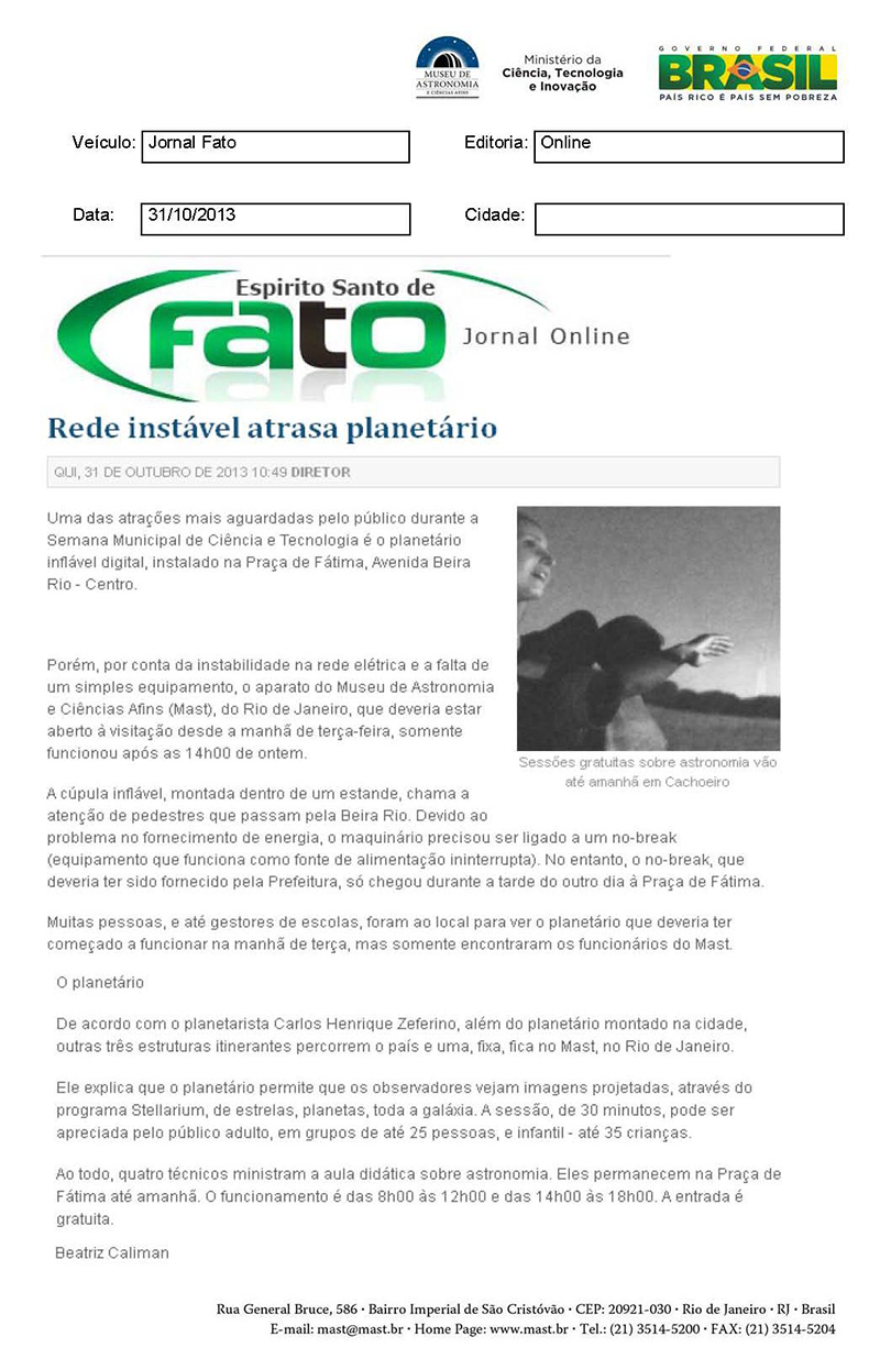 Jornal Fato | Rede instável atrasa planetário