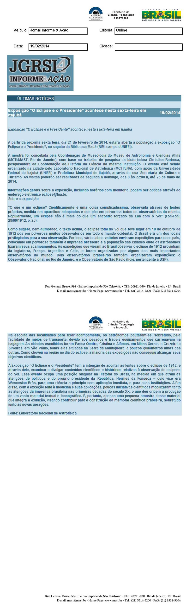 Jornal Informe & Ação | Exposição - "O Eclipse e o Presidente" acontece nesta sexta-feira em Itajubá
