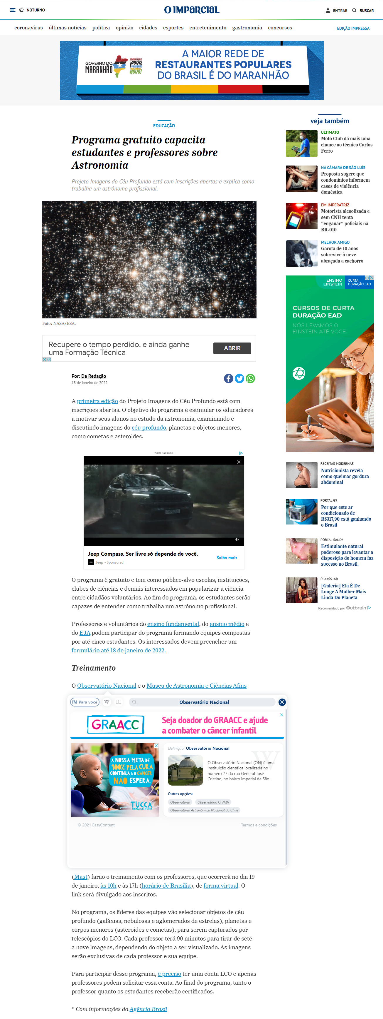 Jornal O Imparcial (São Luís-MA) - MAST na reportagem 'Ministério oferece programa de capacitação sobre astronomia'