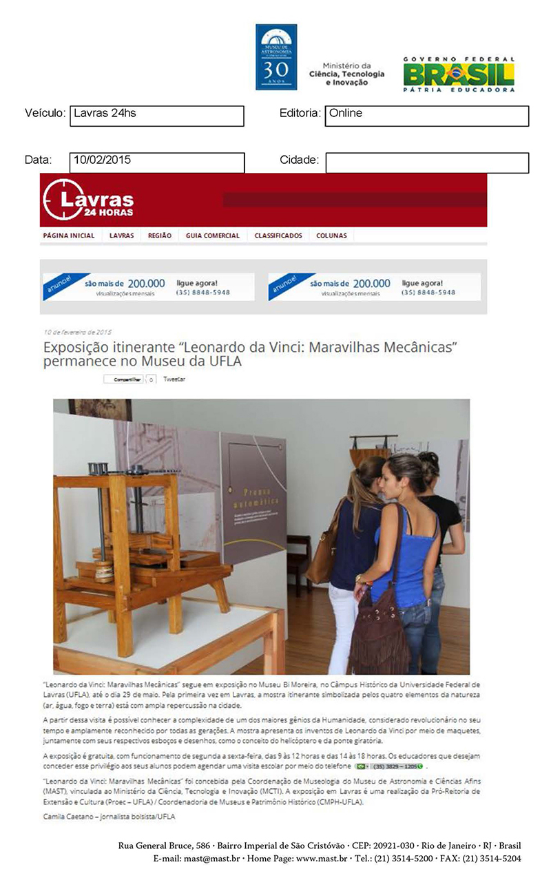 Lavras 24 horas | Exposição itinerante "Leonardo da Vinci: Maravilhas Mecânicas" permanece no Museu da UFLA
