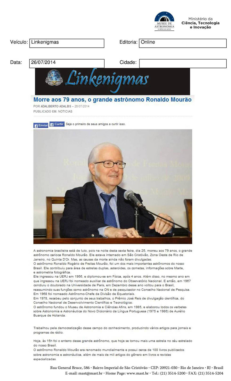 Linkenigmas | Morre aos 79 anos, o grande astrônomo Ronaldo Mourão