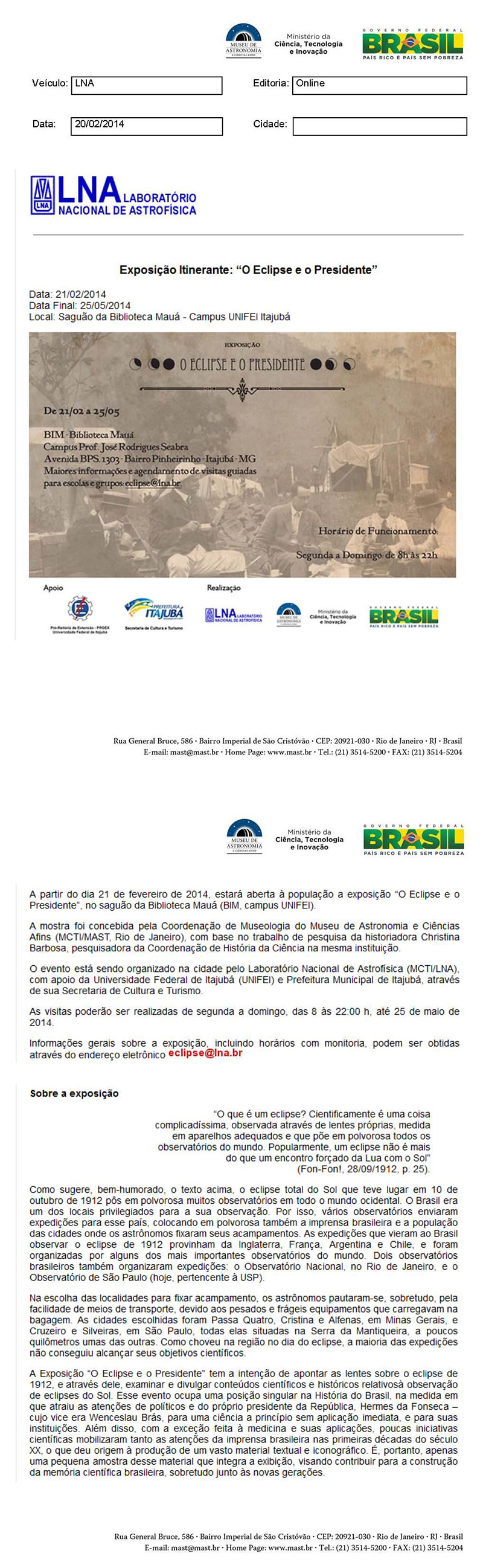 LNA | Exposição itinerante: "O Eclipse e o Presidente"