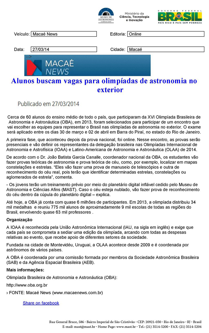 Macaé News | Alunos buscam vagas para olimpíadas de astronomia no exterior