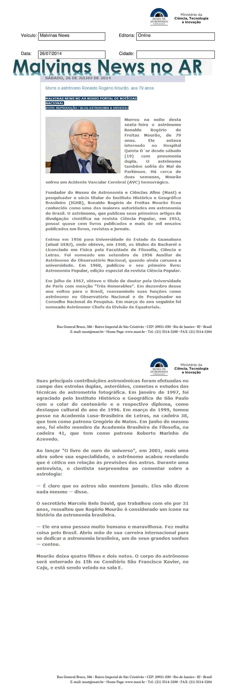 Malvinas News | Morre o astrônomo Ronaldo Mourão, aos 79 anos
