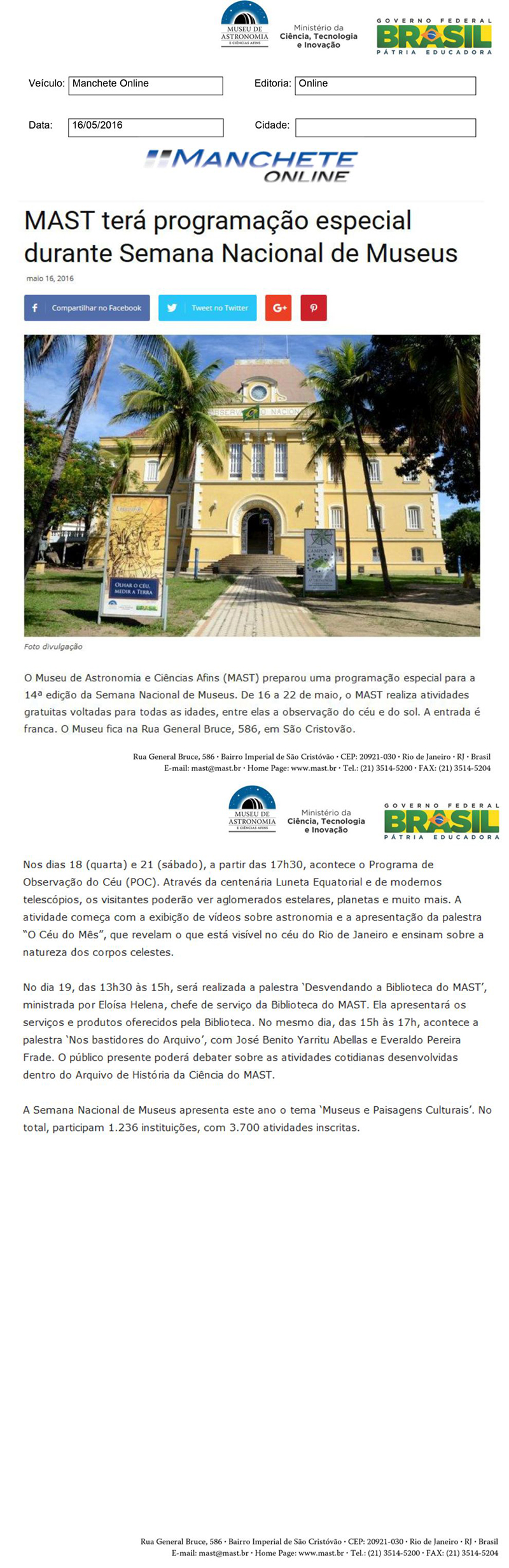 Manchete Online | MAST terá programação especial durante Semana Nacional de Museus