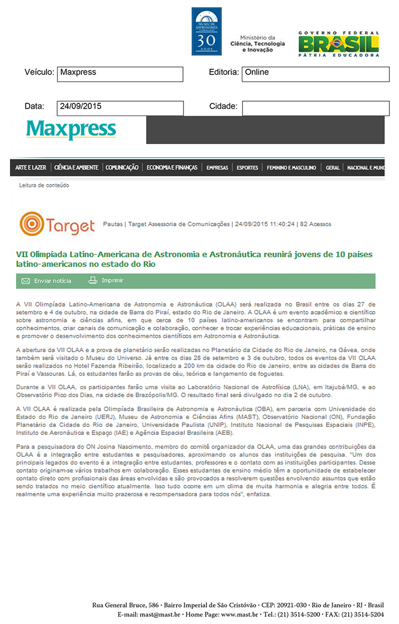 Maxpress | VII Olimpíada Latino-Americana de Astronomia e Astronáutica reunirá jovens de 10 países latino-americanos no estado do Rio