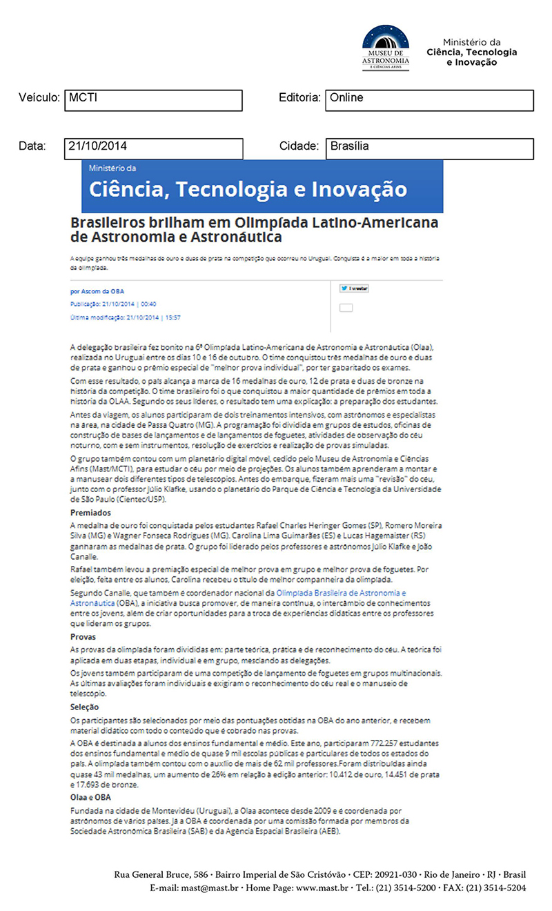 MCTI | Brasileiros brilham em Olimpíada Latino-Americana de Astronomia e Astronáutica