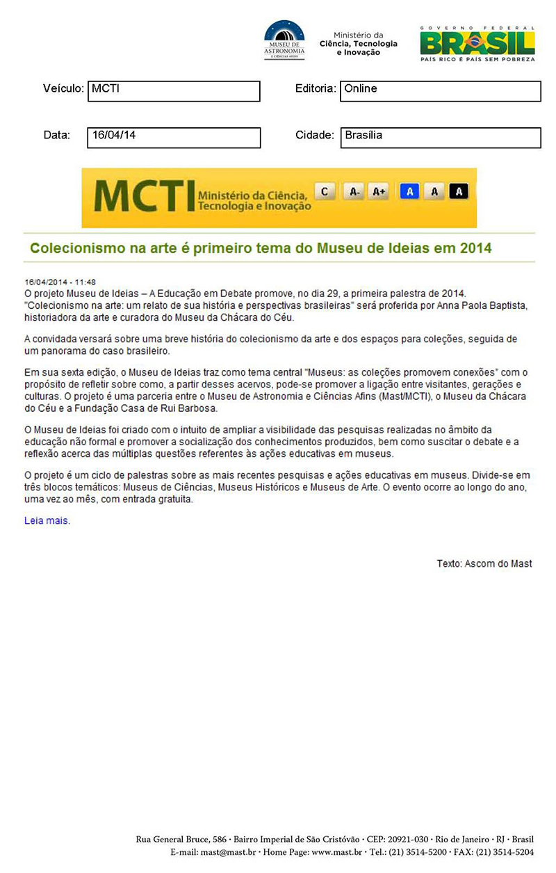 MCTI | Colecionismo na arte é primeiro tema do Museu de Ideias em 2014