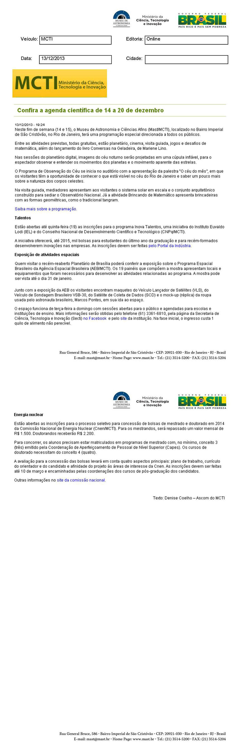 MCTI | Confira a agenda científica de 14 a 20 de dezembro