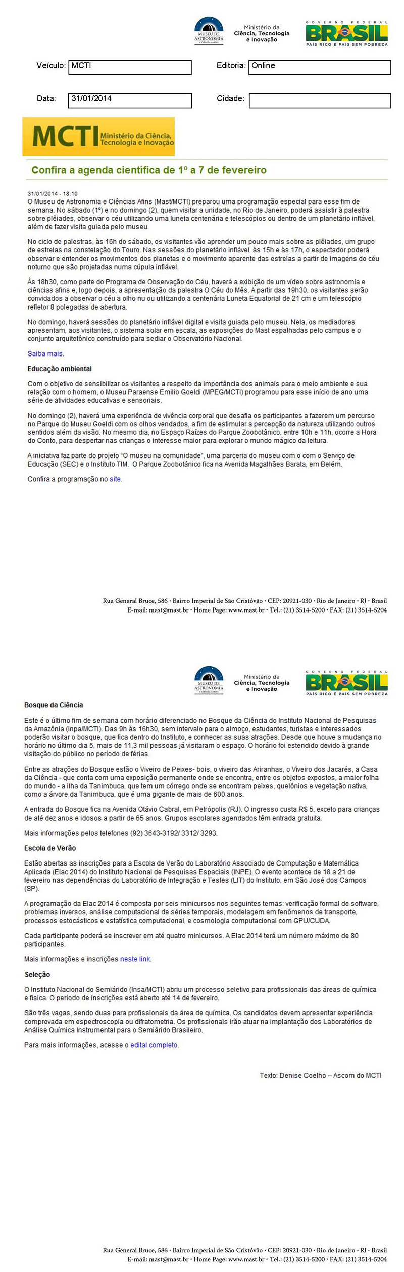 MCTI | Confira a agenda científica de 1º a 7 de fevereiro