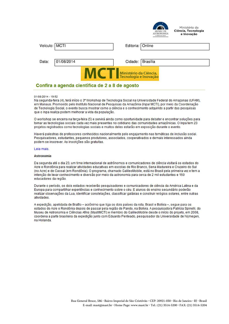 MCTI | Confira a agenda científica de 2 a 8 de agosto