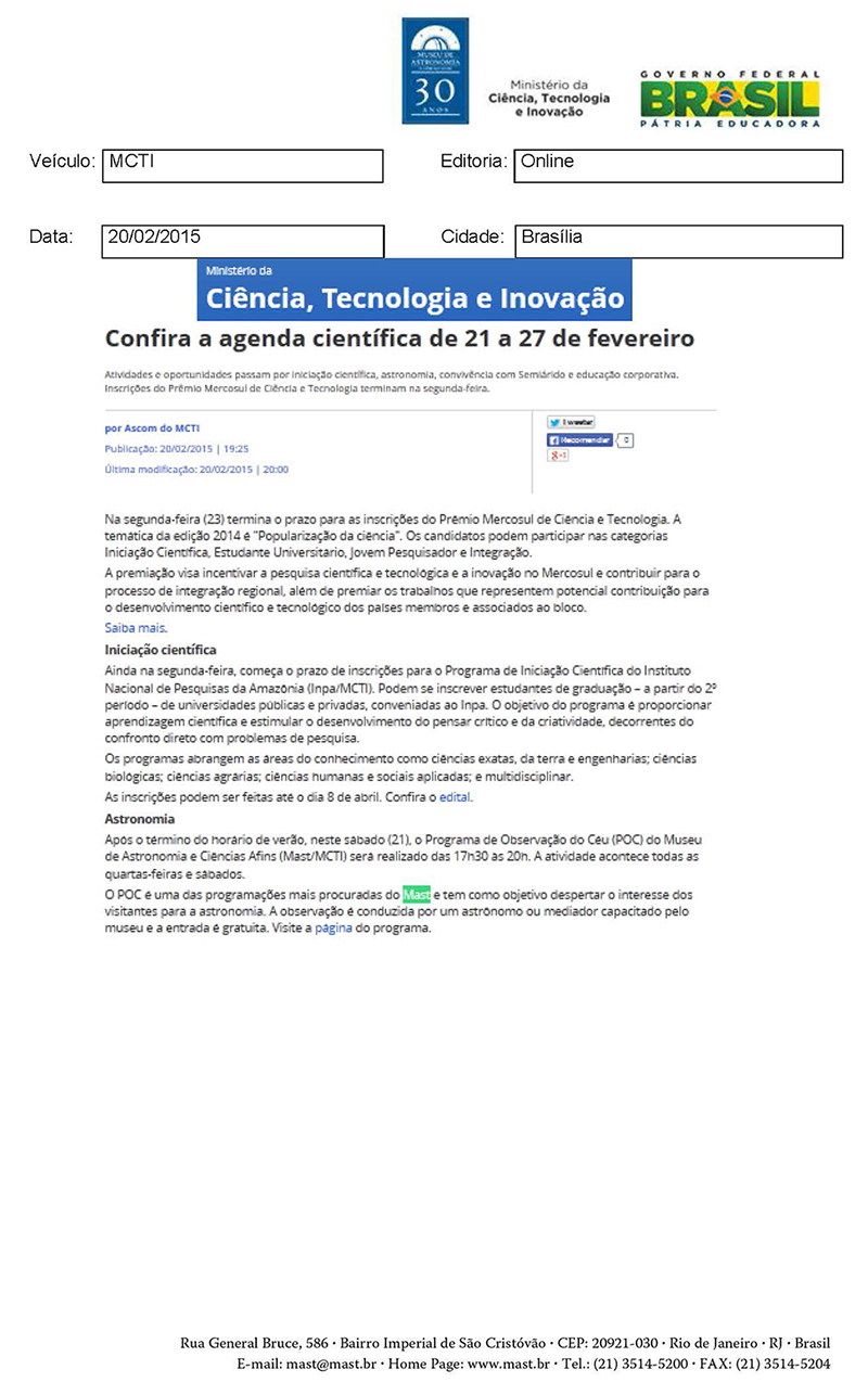 MCTI | Confira a agenda científica de 21 a 27 de fevereiro