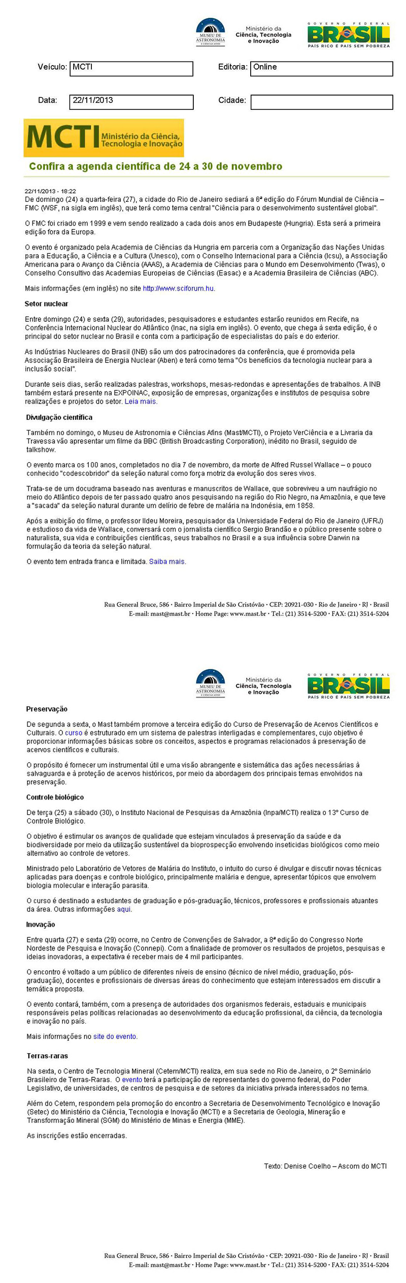 MCTI | Confira a agenda científica de 24 a 30 de novembro
