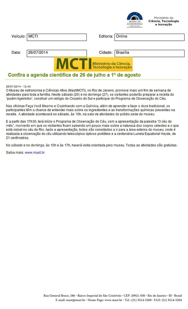 MCTI | Confira a agenda científica de 26 a 1º de agosto
