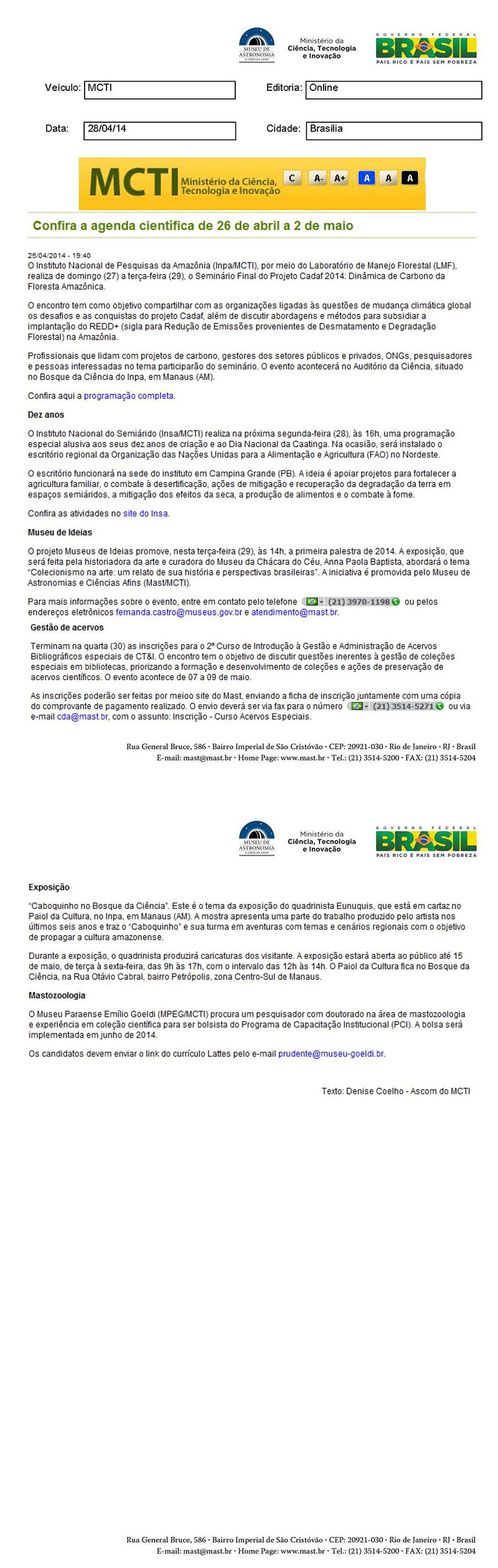 MCTI | Confira a agenda científica de 26 de abril a 2 de maio