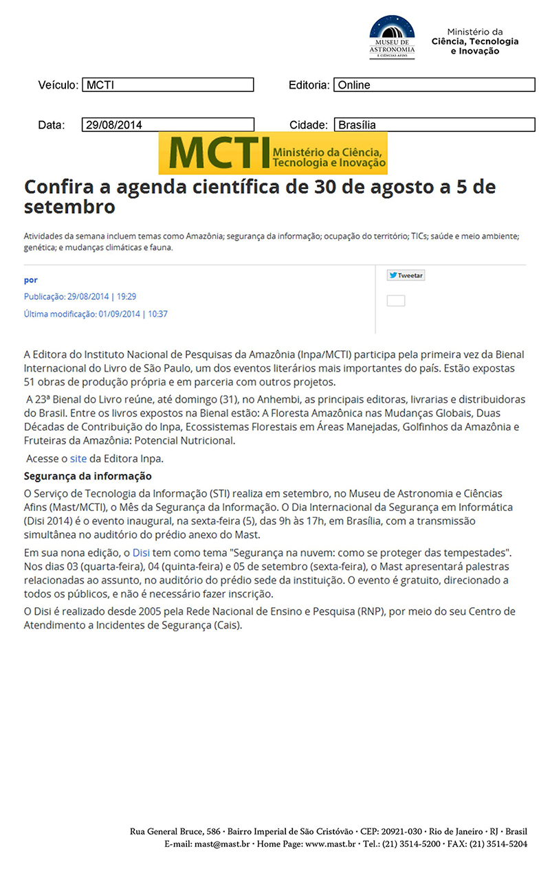 MCTI | Confira a agenda científica de 30 de agosto a 5 de setembro