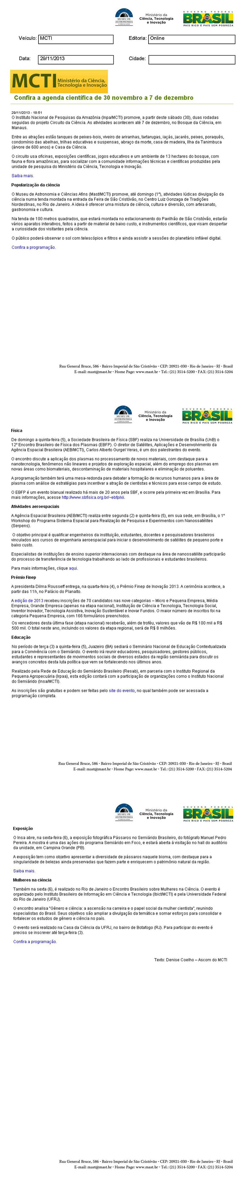 MCTI | Confira a agenda científica de 30 novembro a 7 de dezembro