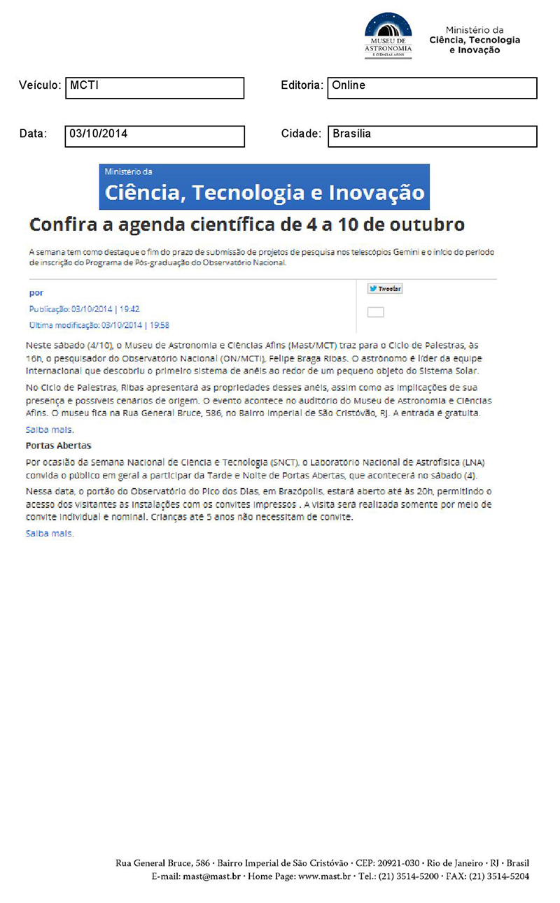 MCTI | Confira a agenda científica de 4 a 10 de outubro