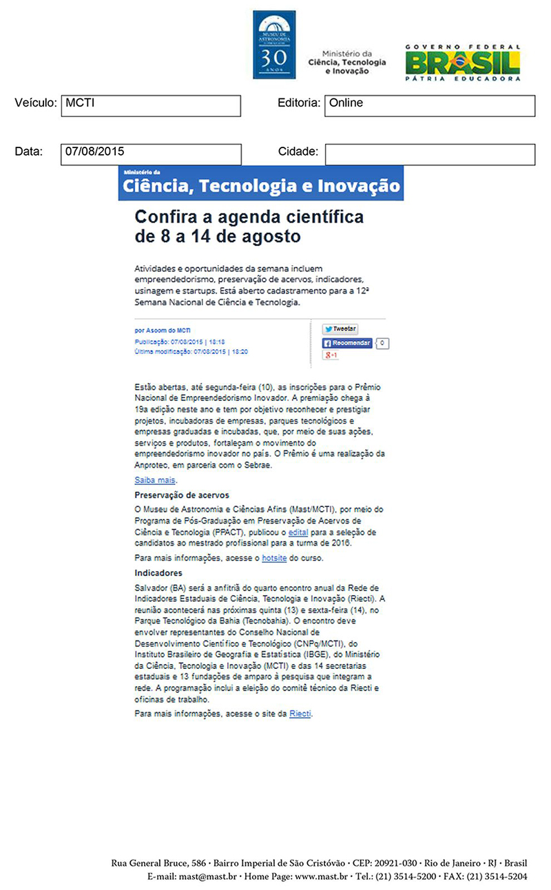 MCTI | Confira a agenda científica de 8 a 14 de agosto
