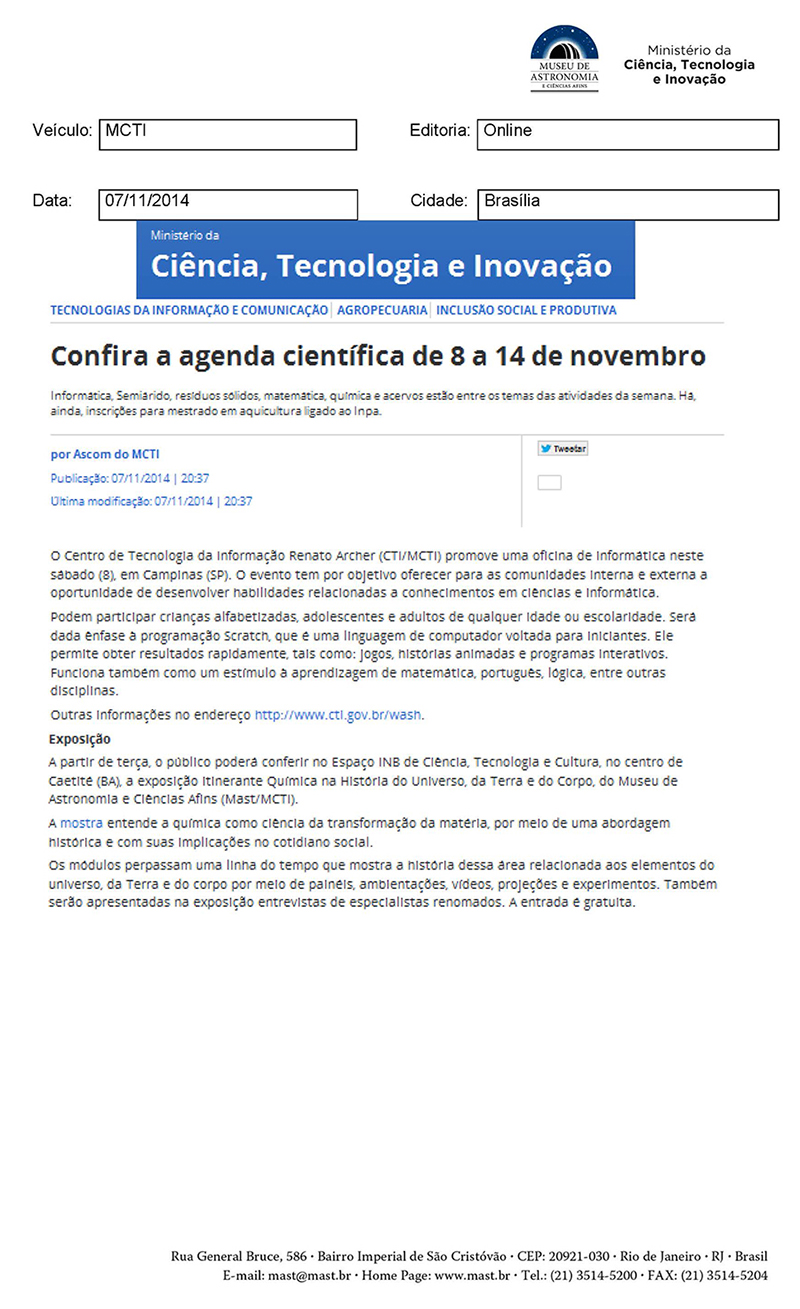 MCTI | Confira a agenda científica de 8 a 14 de novembro