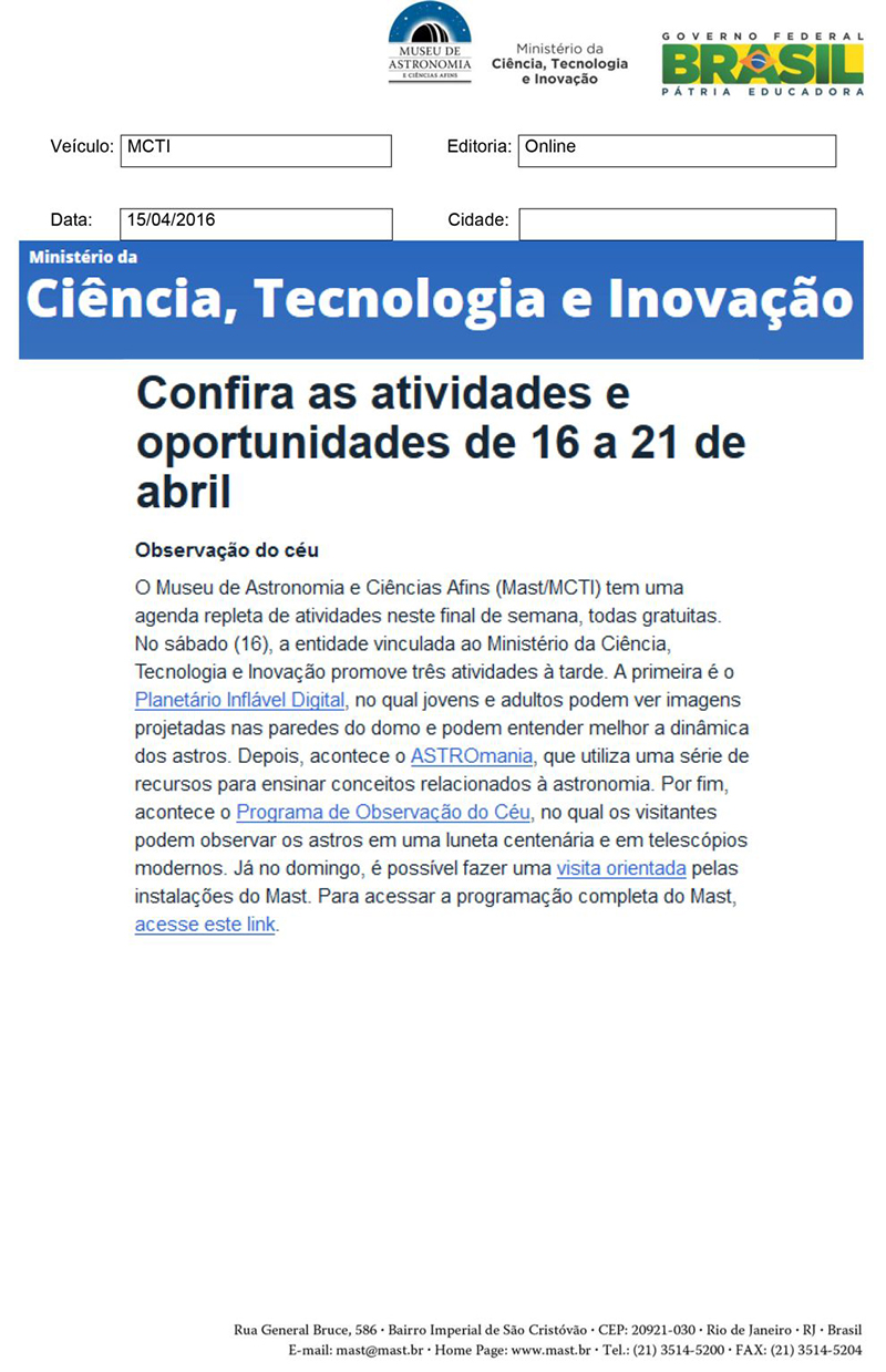 MCTI | Confira as atividades e oportunidades de 16 a 21 de abril