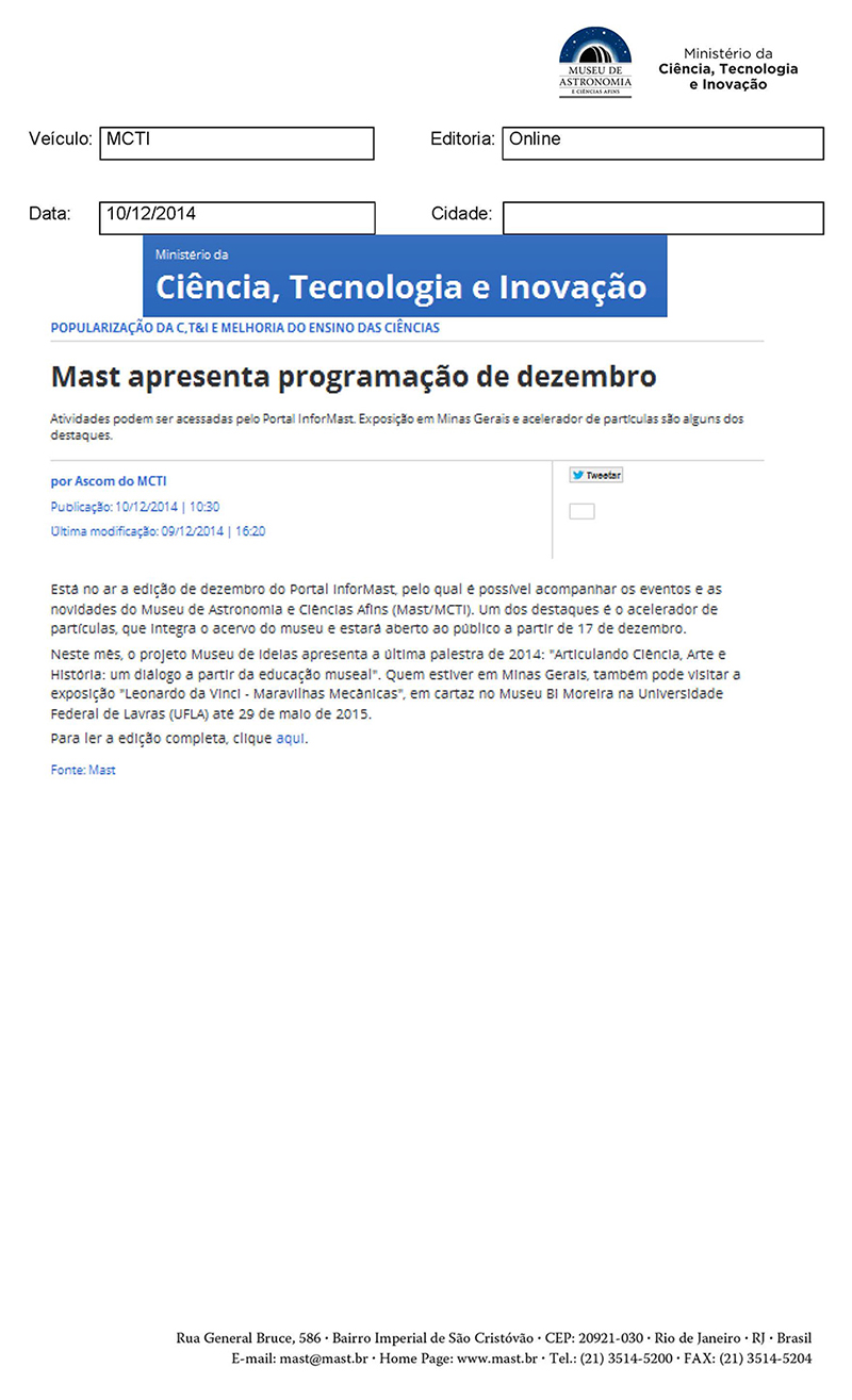MCTI | MAST apresenta programação de dezembro