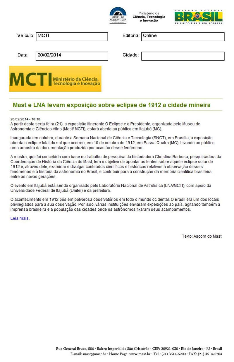 MCTI | MAST e LNA levam exposição sobre eclipse de 1912 a cidade mineira