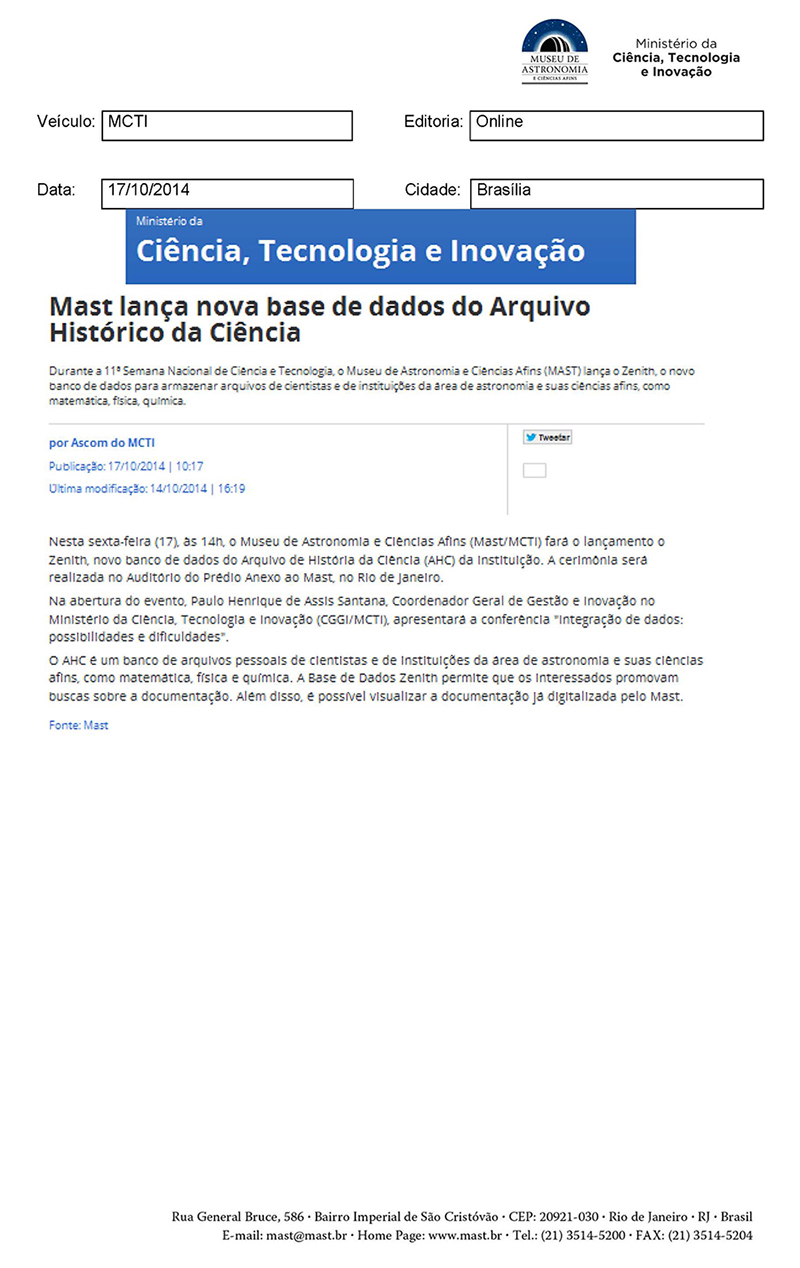 MCTI | MAST lança nova base de dados do Arquivo Histórico da Ciência